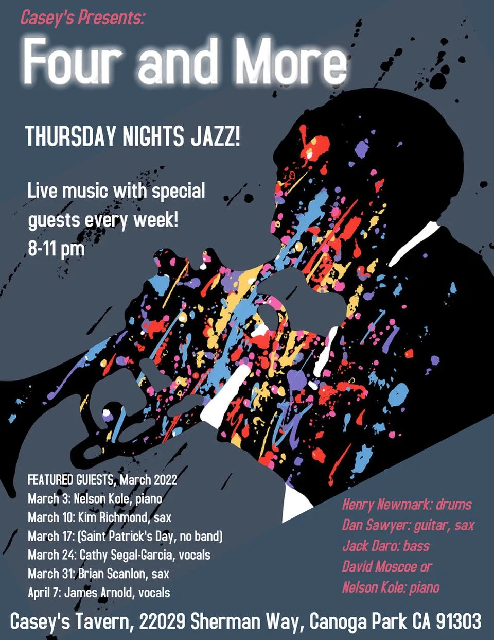 Cathy joins the band at Casey's Tavern in Canoga Park! Thursday, March 24, 2022 8:00 PM 11:00 PM 20:00 23:00 Casey's Tavern Canoga Park, CA (map) Google Calendar ICS March 24th I'm going to join the fun at one of the longest running gigs in L.A!8 - 11 pm // No coverCome hang out, it's an old established bar in Canoga Park!